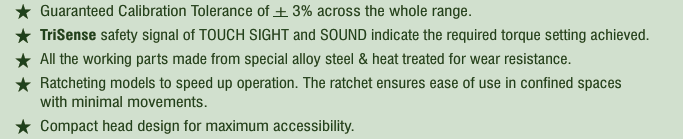 These torque wrenches are calibrated to provide a guaranteed accuracy tolerance of plus or minus three percent across the entire operating range, supporting quality critical tightening applications. The tools are equipped with a TriSense safety indication system that provides clear tactile, visual, and audible feedback, allowing operators to confidently identify when the preset torque value has been achieved.