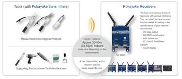 Available transmitter variants include standard, compact, and slim types to suit different tools, space constraints, and battery life requirements. Pokayoke receivers provide outputs suitable for system integration, including relay, LAN, RS-232C, and fieldbus interfaces, allowing easy connection with PLCs and production control systems.