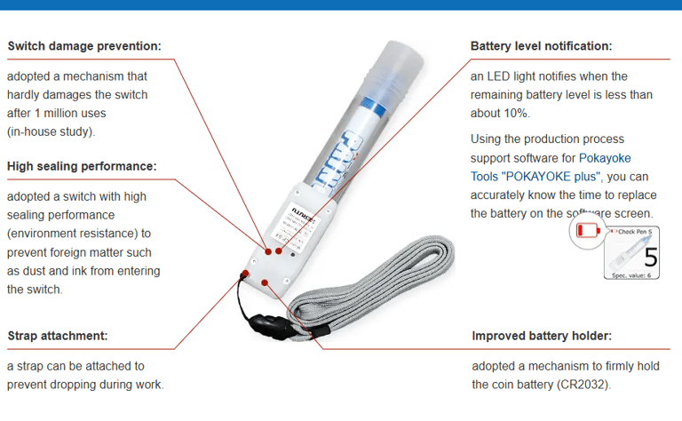 The Check Pen S is a wireless marking pen designed to prevent omission of marking operations on production lines. It communicates wirelessly with Pokayoke receivers to confirm that each required marking step has been performed.