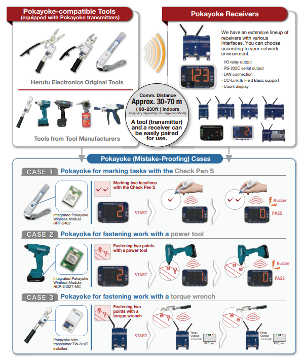 HERUTU Electronics Corporation’s Pokayoke tools are industrial wireless solutions designed to help manufacturers implement effective mistake-proofing (Poka-yoke) in assembly and production processes. These tools support quality control, error prevention, task traceability, and process synchronization by enabling wireless communication between work tools and control systems.
