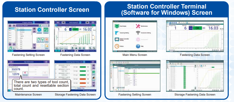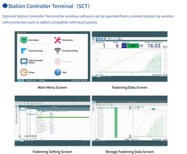 The SHBN system includes a high-performance Station Controller that can manage up to four tools simultaneously. Operations such as displaying fastening data, accessing history, and adjusting settings are available through a touch panel LCD screen.