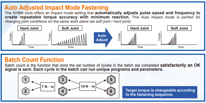 The SHBN nutrunner delivers both high accuracy and high speed fastening with a lightweight design that reduces operator strain. An ergonomic Impact Mode suppresses reaction force during tightening, making tool operation smoother and less fatiguing even at higher torque levels.Impact Mode & Auto Adjusted Impact Mode