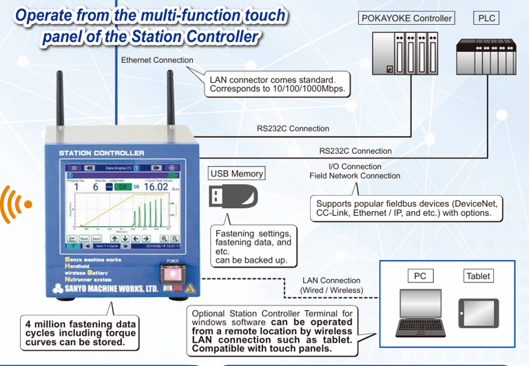 The controller supports high-capacity data storage (up to 4 million records including torque waveforms) and offers connectivity options including USB backup, wired LAN, fieldbus communication interfaces (DeviceNet, CC-Link, Ethernet/IP, etc.), and optional wireless LAN support for flexible networking and integration with factory systems.